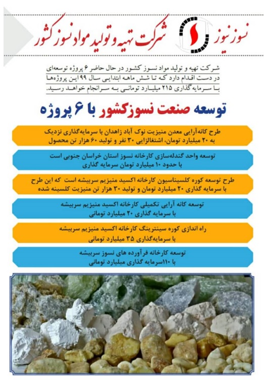 شرکت تهیه و تولید مواد نسوز کشور تا پایان شهریورماه سال آینده، ۶ پروژه را با سرمایه گذاری ۲۱۵ میلیارد تومانی به بهره برداری خواهد رساند.